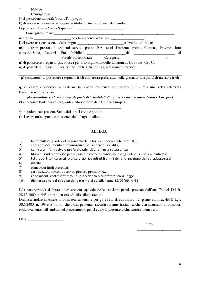 Di essere appartenente alle categorie previste dall™ar t. In relazione al punto b), il sottoscritto dichiara di aver prestato lodevole servizio nelle amministrazioni pubbliche (indicare l'amministrazione presso cui si è prestato il lodevole servizio, il periodo di riferimento, gli Infatti quella dicitura sulla precedenza a parità di punteggio non è stata.