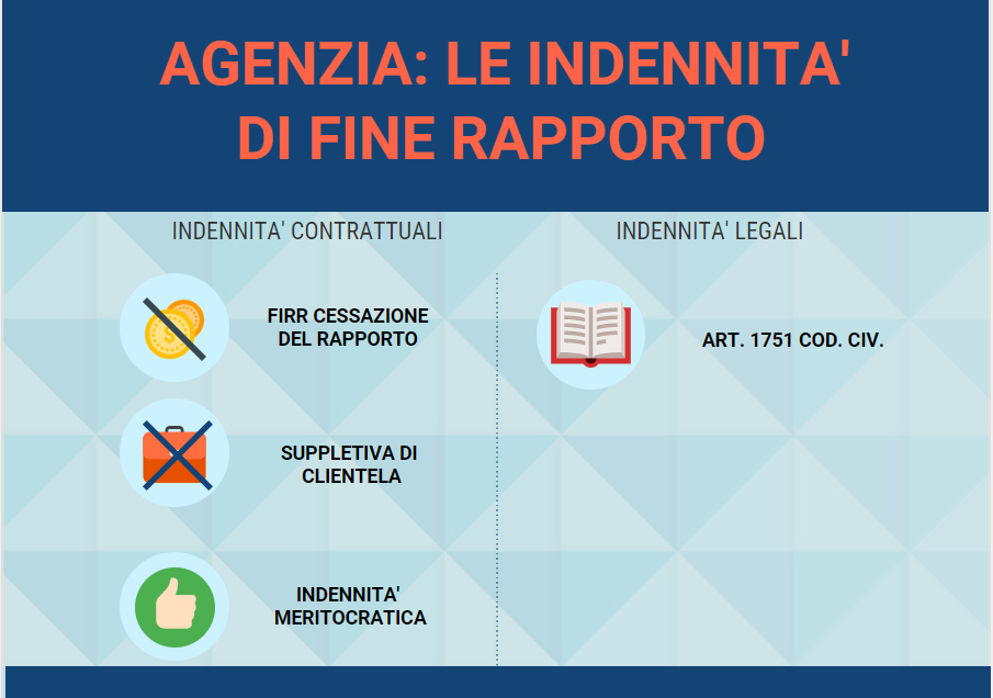 L'indennità fine rapporto agenti è dovuta se il rapporto cessa non per colpa dell'agente. Questa indennità è stata introdotta nel nostro ordinamento in seguito al recepimento della direttiva europea. L'indennità di cessazione del rapporto costituisce indubbiamente uno degli istituti più importanti sul piano della tutela dell'agente, e, al tempo stesso, uno degli aspetti maggiormente critici e problematici nell'ambito del rapporto di agenzia.
